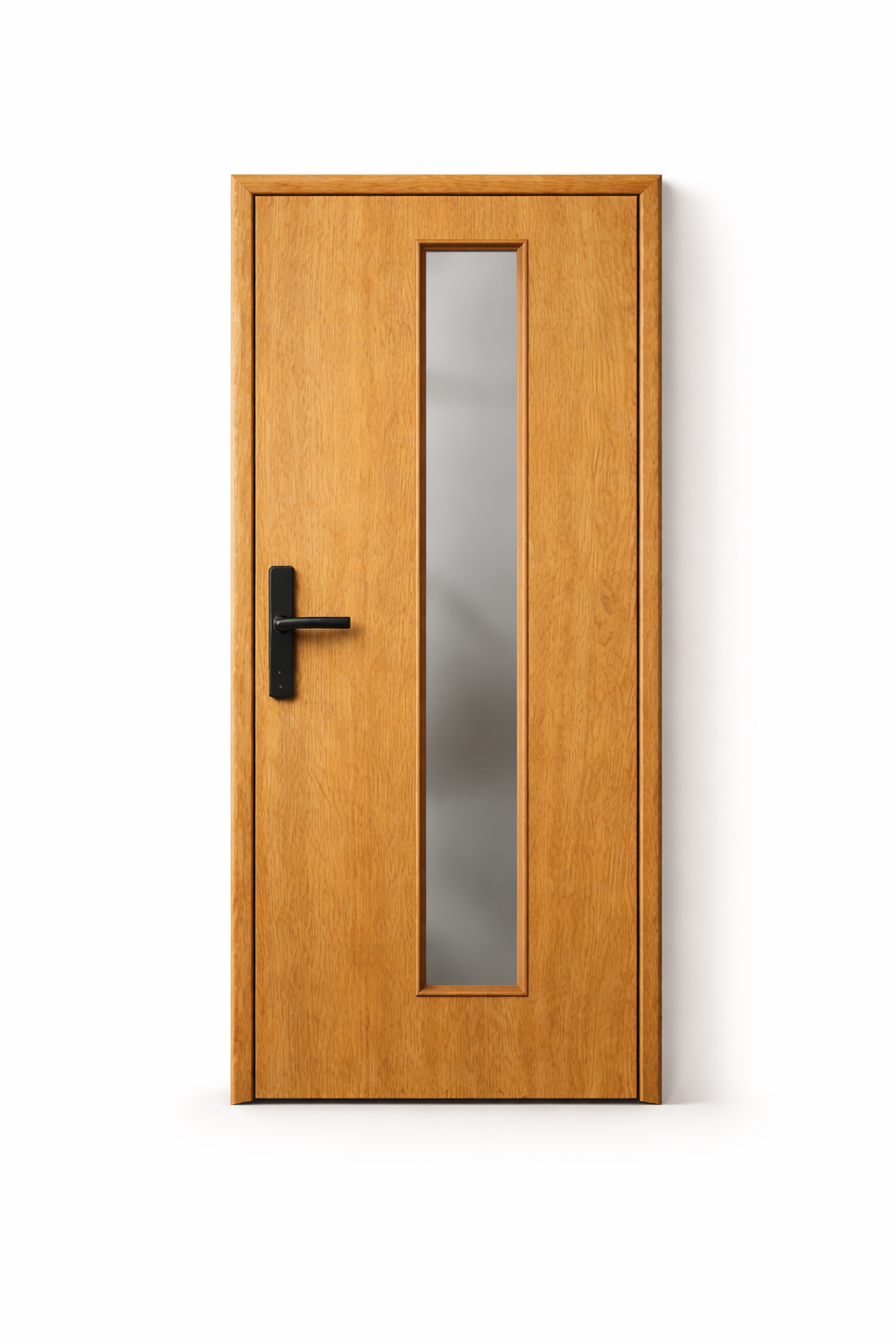 Modern door with long vertical glass insert.