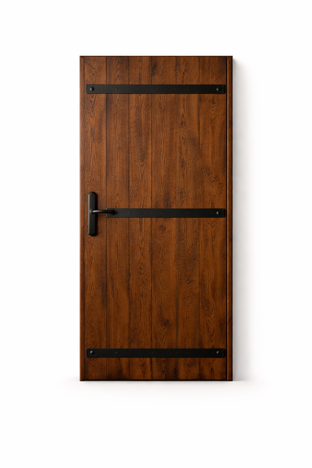 Vertical wood planks with iron strap hinges.